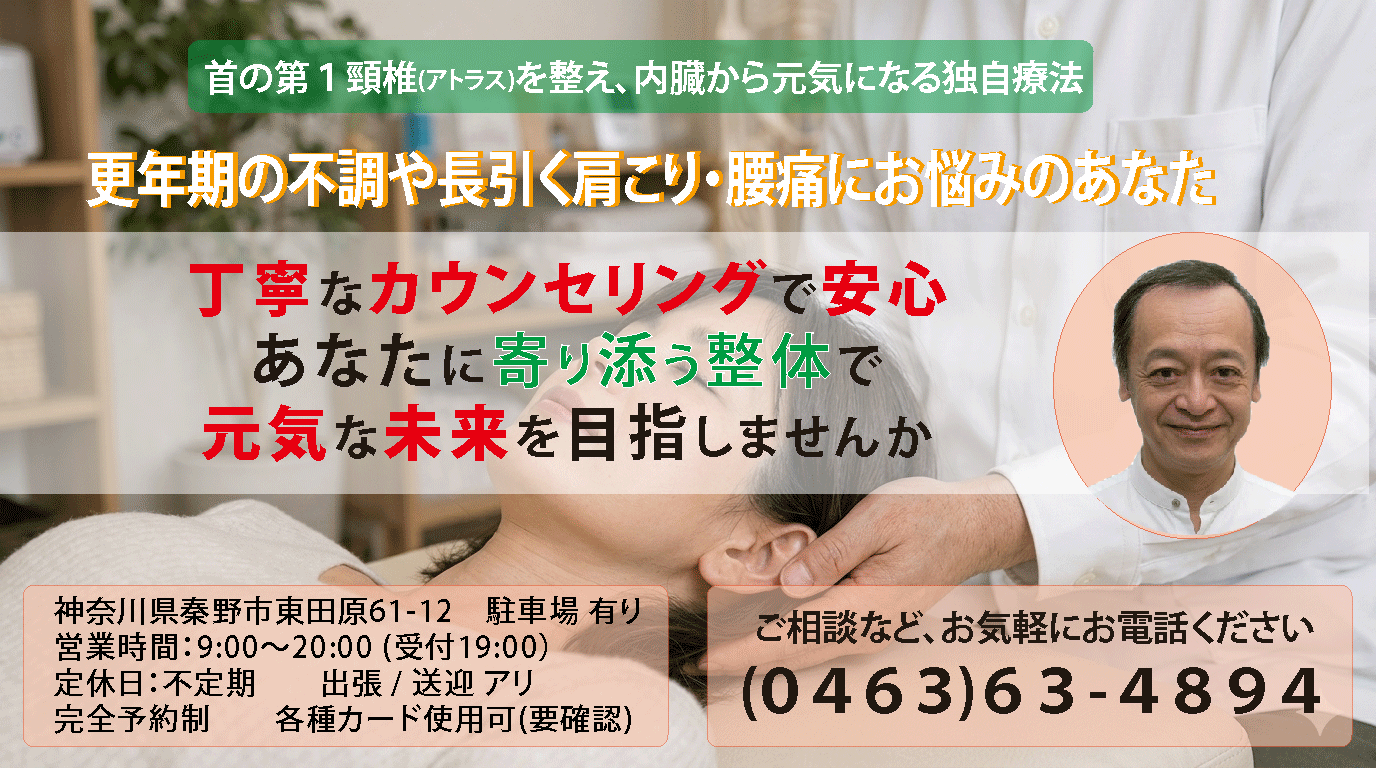 皆さん、こんにちは! 「自然療法 アトラス コア バランス」の院長、ヤマガタです。 毎日のお仕事や家事、本当にお疲れ様です。40代、50代と年齢を重ねるごとに、体のあちこちに「今までなかったサイン」を感じる方も多いのではないでしょうか。「肩が上が… -
