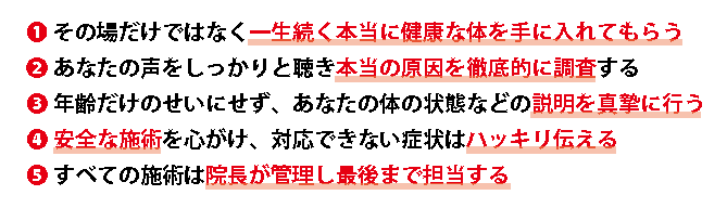 今後も当院を頼ってくださる方には、痛みや不調のない質の高い生活を手に入れてもらうために、以下の5つのことを心掛けていきます。