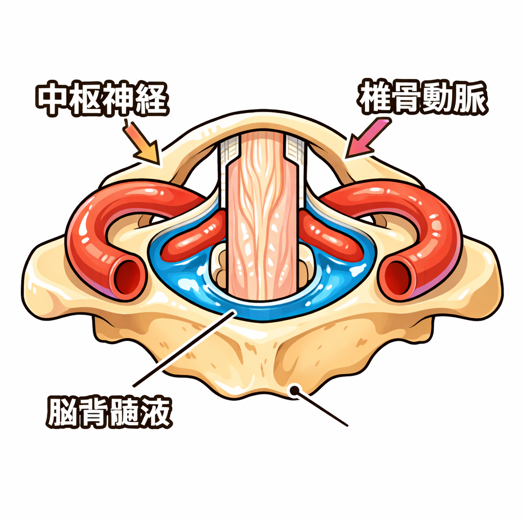 第一頸椎(アトラス)は、背骨(24個)の一番上にあって頭蓋骨(ボーリングのボウルくらいの重さ)を支える重要な骨。中央に大きな穴(脊柱管)があって生命維持に欠かせない重要なものが通っています。