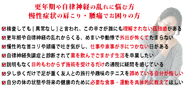 そして不調の原因や通院に関する情報は隠すことなくお伝えしますが、他のお客様がいないマンツーマンですので、気になることや不明なことは自由に尋ねてください。そうすることであなたと一緒に不調を改善をする一生のパートナーを目指します。